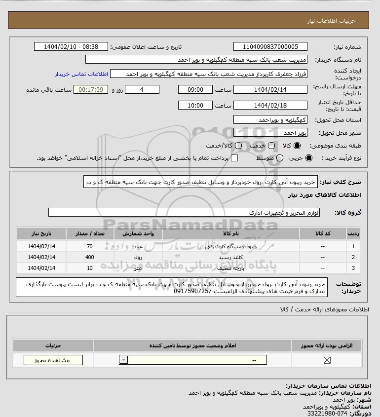 | 1 | -- | ریبون دستگاه کارت زنی | عدد | 70 | 1404/02/14 |