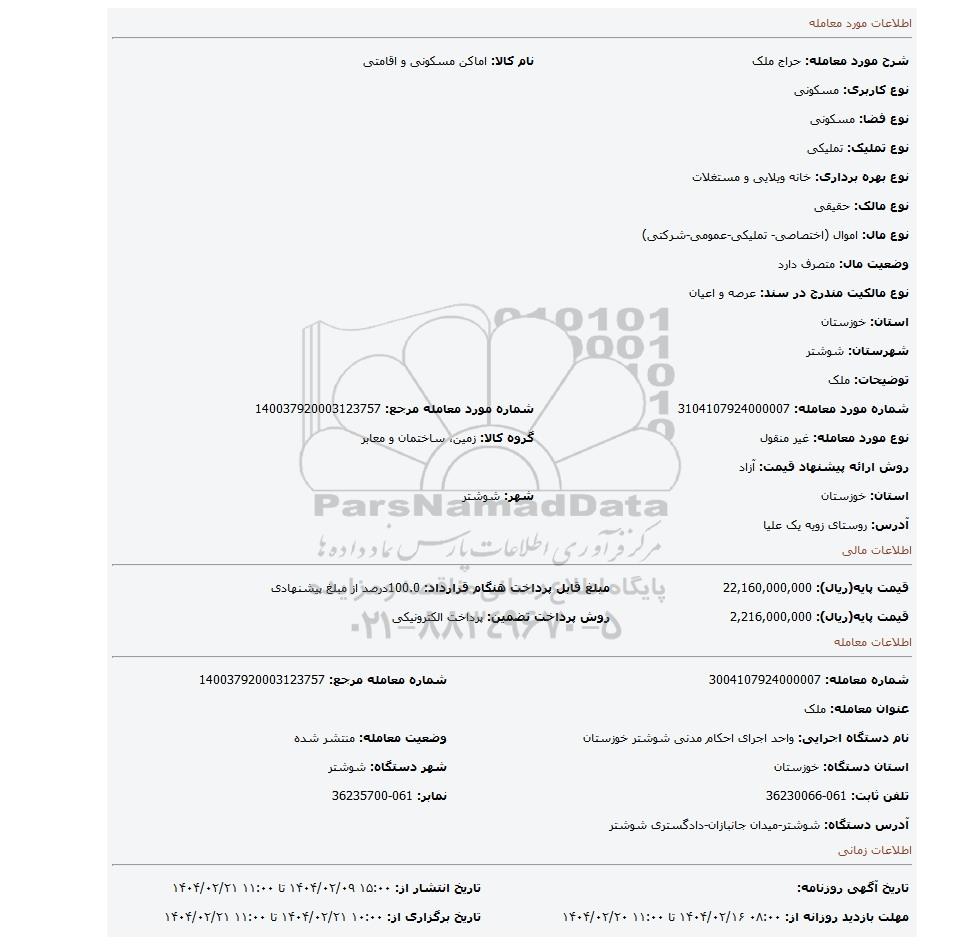 مزایده عمومی مزایده ملک برگزار میگردد. از کلیه افراد متخصص و شرکت‌های واجد شرایط دعوت به عمل می‌آید تا در این مزایده با کد خبرگزاری پارس نماد : 8952582 شرکت نمایند تاریخ شروع مزایده : 1404/02/09 مهلت شرکت در مزایده: تا پایان روز 1404/02/21 مکان برگزاری اموال واگذاری استان‌های خوزستان و دسته‌بندی‌های مربوط به این حراجی املاک و زمین میباشد.