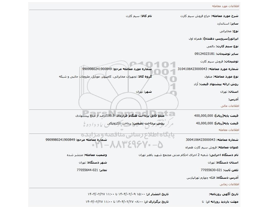 شرح مورد معامله: حراج فروش سیم کارتنام کالا: سیم کارت