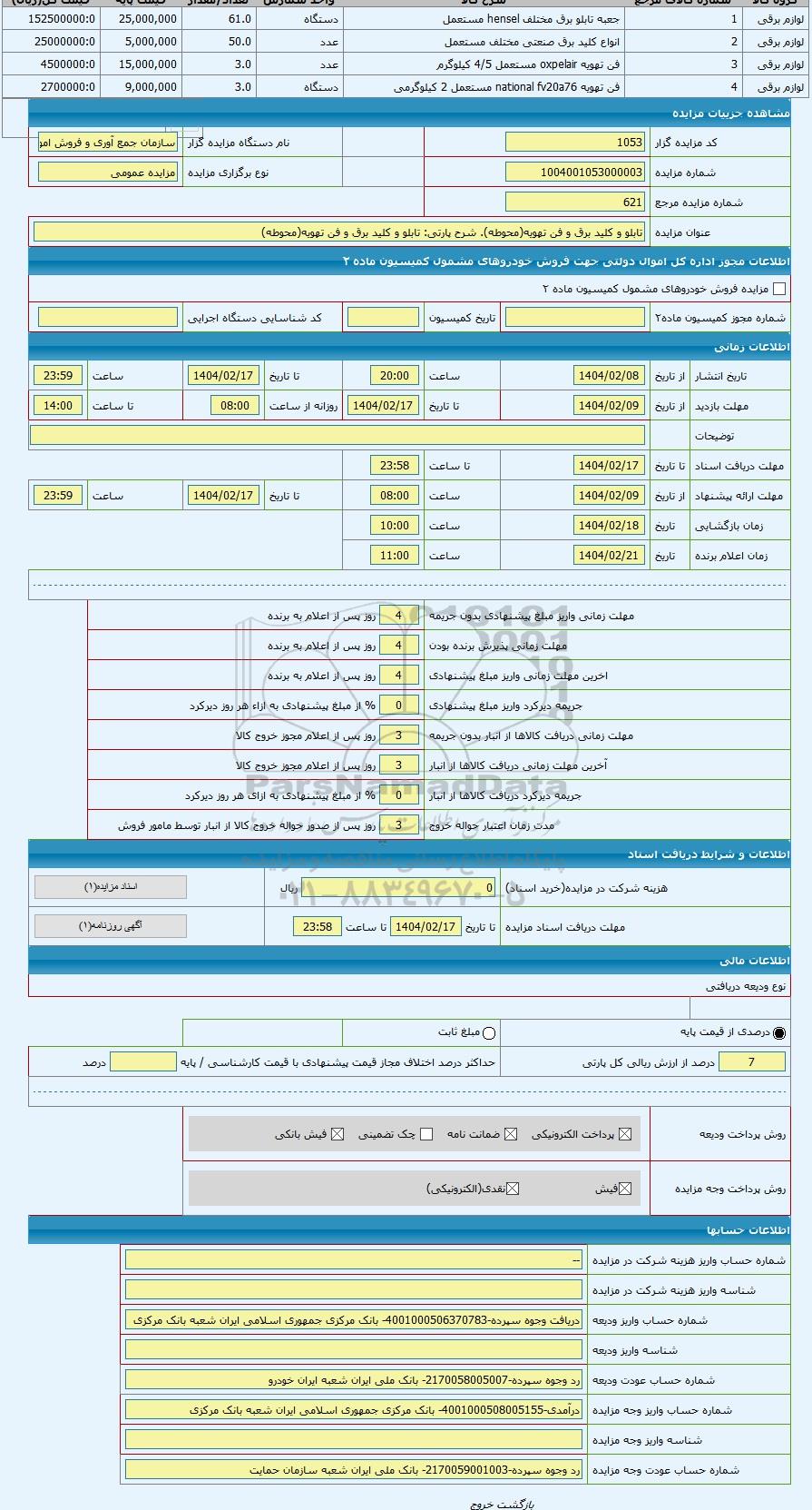 📞 برای دریافت اطلاعات بیشتر در خصوص، حراج، حراجی، فروش اقلام مازاد، واگذاری تجهیزات، فروش اموال مازاد، فروش دستگاه‌های دست دوم، فروش ماشین‌آلات کارکرده، مزایده عمومی، مزایده آنلاین، خرید به ارزانترین قیمت و فروش با بالاترین قیمت لطفاً با سامانه مناقصات و مزایدات ایران پارس نماد داده‌ها به شماره 88349670 تماس حاصل فرمایید.