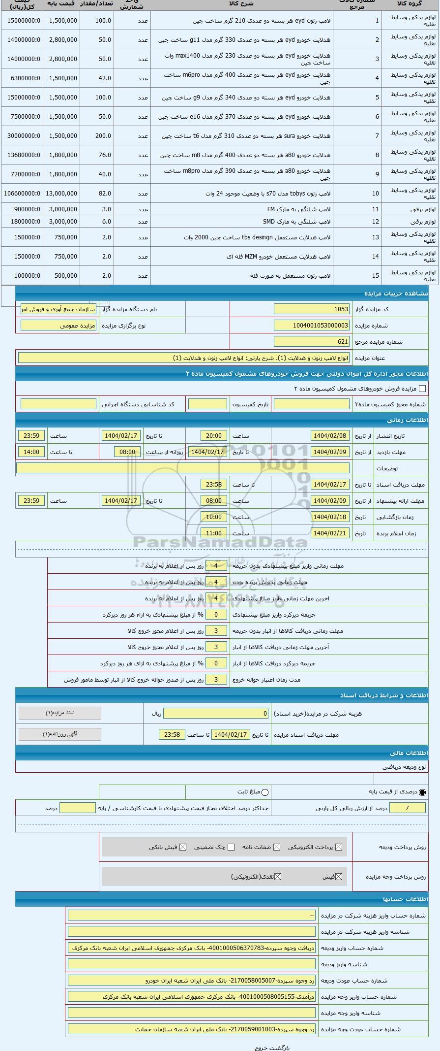| عنوان مزایده | انواع لامپ زنون و هدلایت (1) | |||