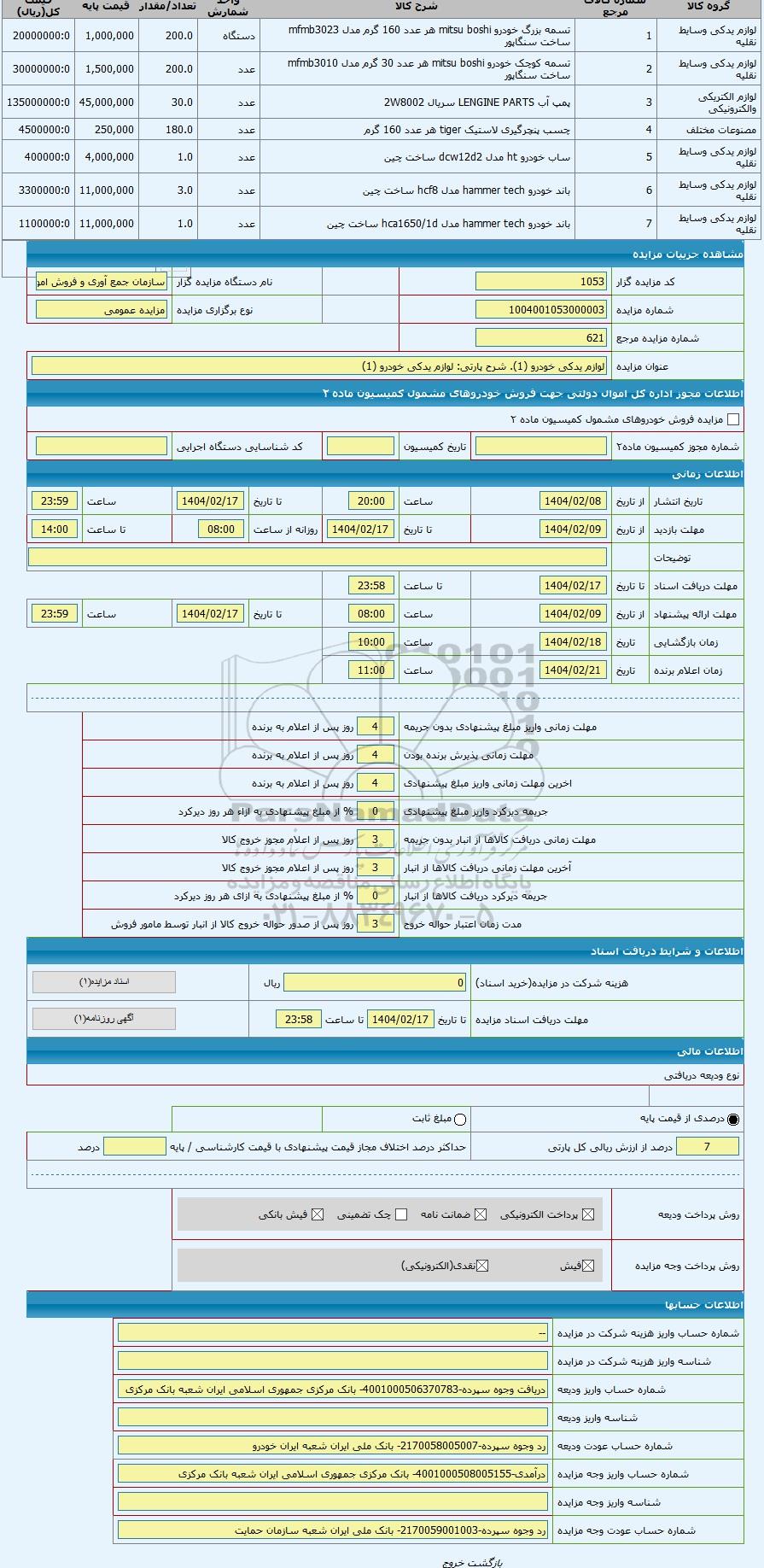 | عنوان مزایده | لوازم یدکی خودرو (1) | |||