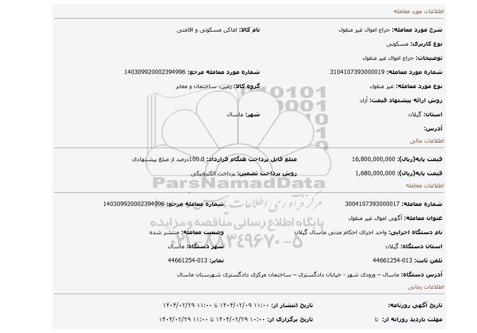 | نام دستگاه اجرایی: واحد اجرای احکام مدنی ماسال گیلان | وضعیت معامله: منتشر شده | |