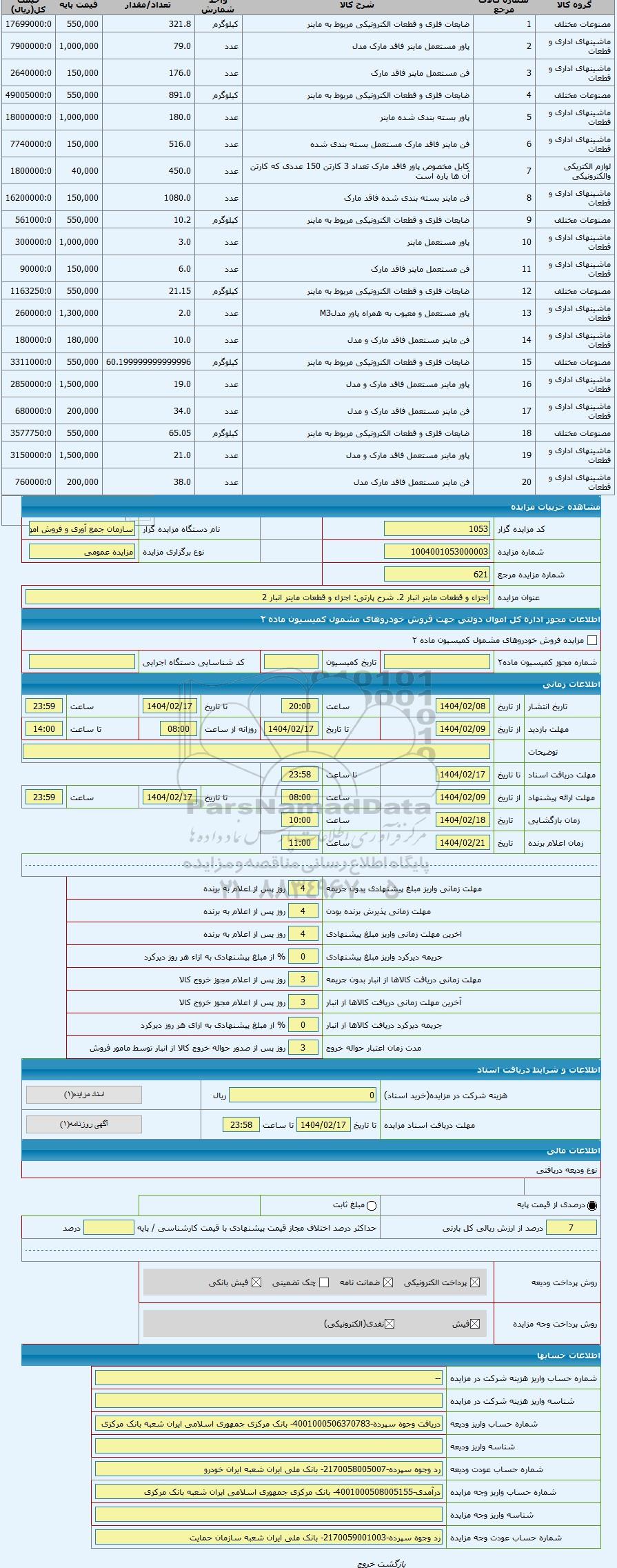 | کد مزایده گزار | 1053 | نام دستگاه مزایده گزار | سازمان جمع آوری و فروش اموال تملیکی | |
