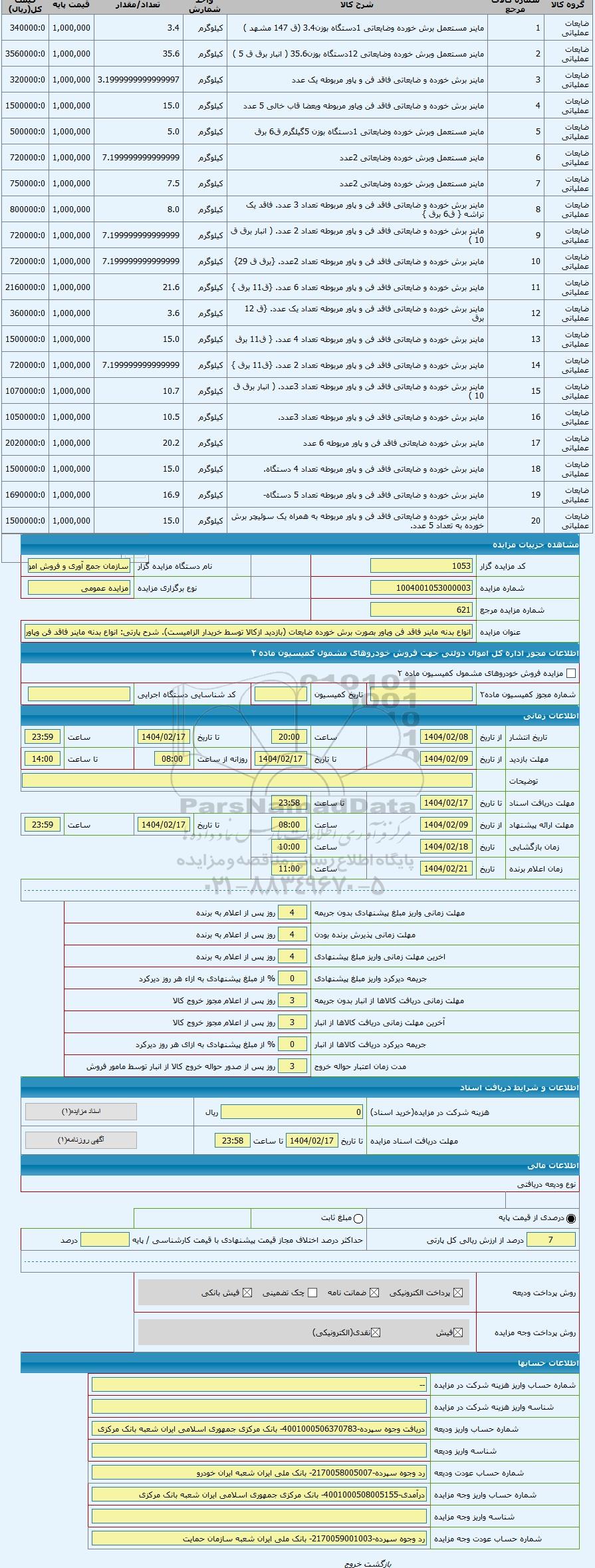 | ضایعات عملیاتی | 20 | ماینر برش خورده و ضایعاتی فاقد فن و پاور مربوطه به همراه یک سوئیچر برش خورده به تعداد 5 عدد. | کیلوگرم | 15.0 | 1,000,000 | 1500000:0 |