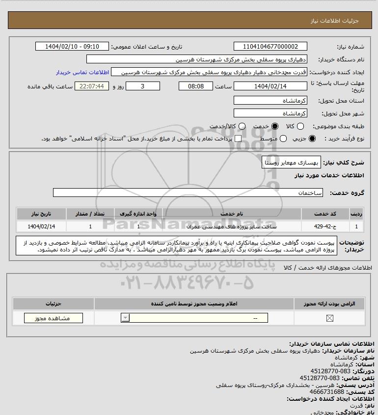 توضیحات خریدار:پیوست نمودن گواهی صلاحیت پیمانکاری اینیه یا راه و برآورد پیمانکاردر سامانه الزامی میباشد. مطالعه شرایط خصوصی و بازدید از پروژه الزامی میباشد. پیوست نمودن برگ بازدید ممهور به مهر دهیارالزامی میباشد . به مدارک ناقص ترتیب اثر داده نمیشود.