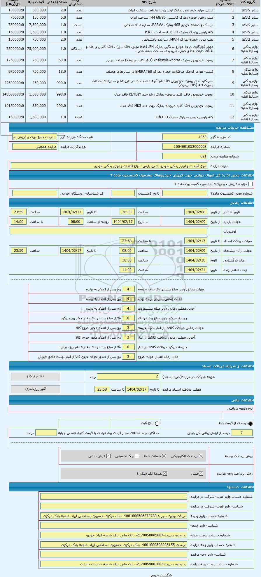 مزایده انواع قطعات و لوازم یدکی خودرو, مزایده ، انواع قطعات و لوازم یدکی خودرو