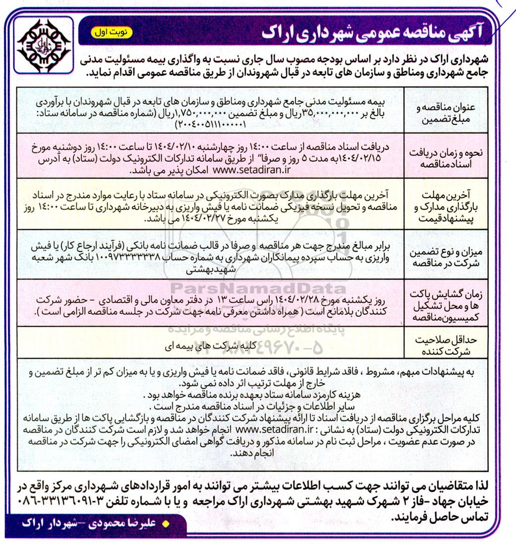 شهرداری اراک در نظر دارد بر اساس بودجه مصوبه سال جاری نسبت به واگذاری بیمه مسئولیت مدنی جامع شهرداری و مناطق و سازمان های تابعه در قبال شهروندان از طریق مناقصه عمومی اقدام نماید.