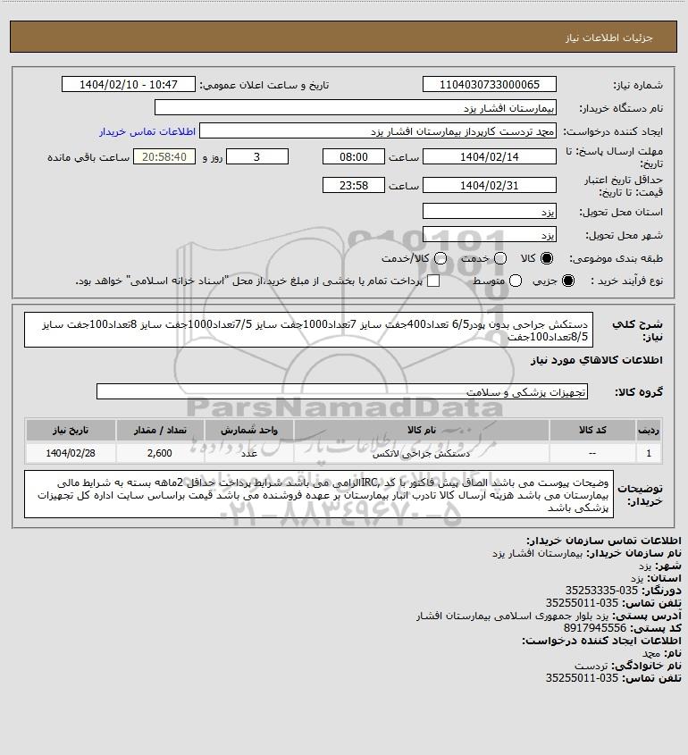 | 1 | -- | دستکش جراحی لاتکس | عدد | 2,600 | 1404/02/28 |