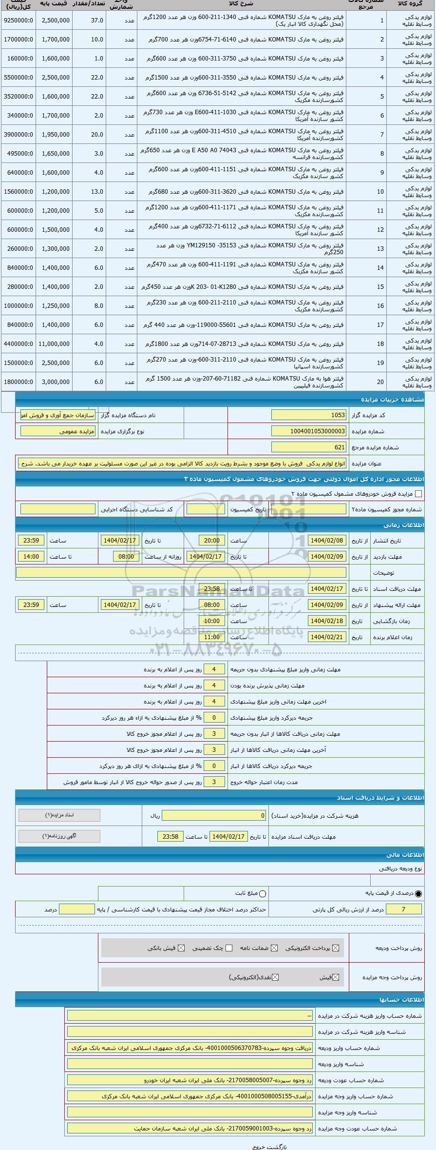 | لوازم یدکی وسایط نقلیه | 18 | فیلتر روغن به مارک KOMATSU شماره فنی 28713-07-714وزن هر عدد 1800گرم | عدد | 4.0 | 11,000,000 | 4400000:0 |