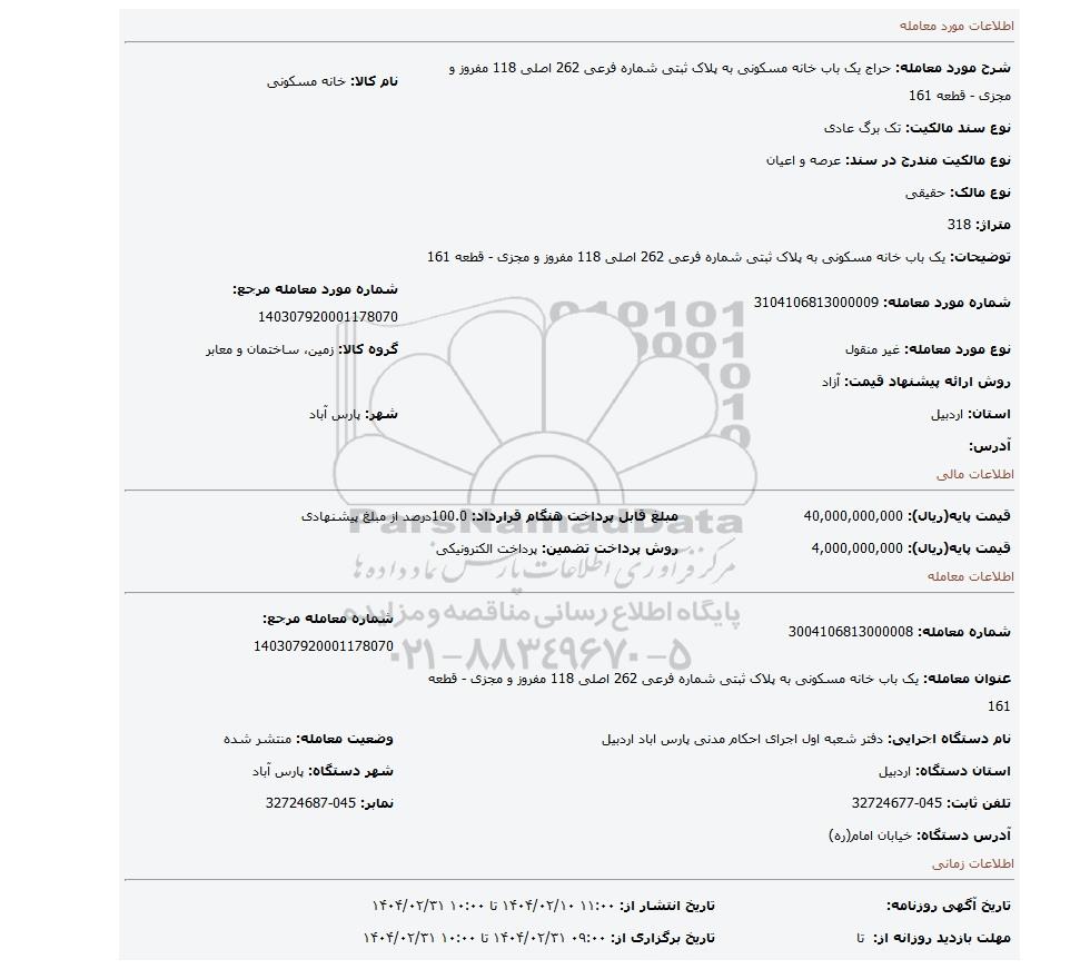 مزایده عمومی مزایده یک باب خانه مسکونی به پلاک ثبتی شماره فرعی 262 اصلی 118 مفروز و مجزی - قطعه 161 برگزار میگردد. از کلیه افراد متخصص و شرکتهای واجد شرایط دعوت به عمل میآید تا در این مزایده با کد خبرگزاری پارس نماد : 8954345 شرکت نمایند تاریخ شروع مزایده : 1404/02/10 مهلت شرکت در مزایده: تا پایان روز 1404/02/31 مکان برگزاری اموال واگذاری استانهای اردبیل و دستهبندیهای مربوط به این حراجی املاک و زمین میباشد.