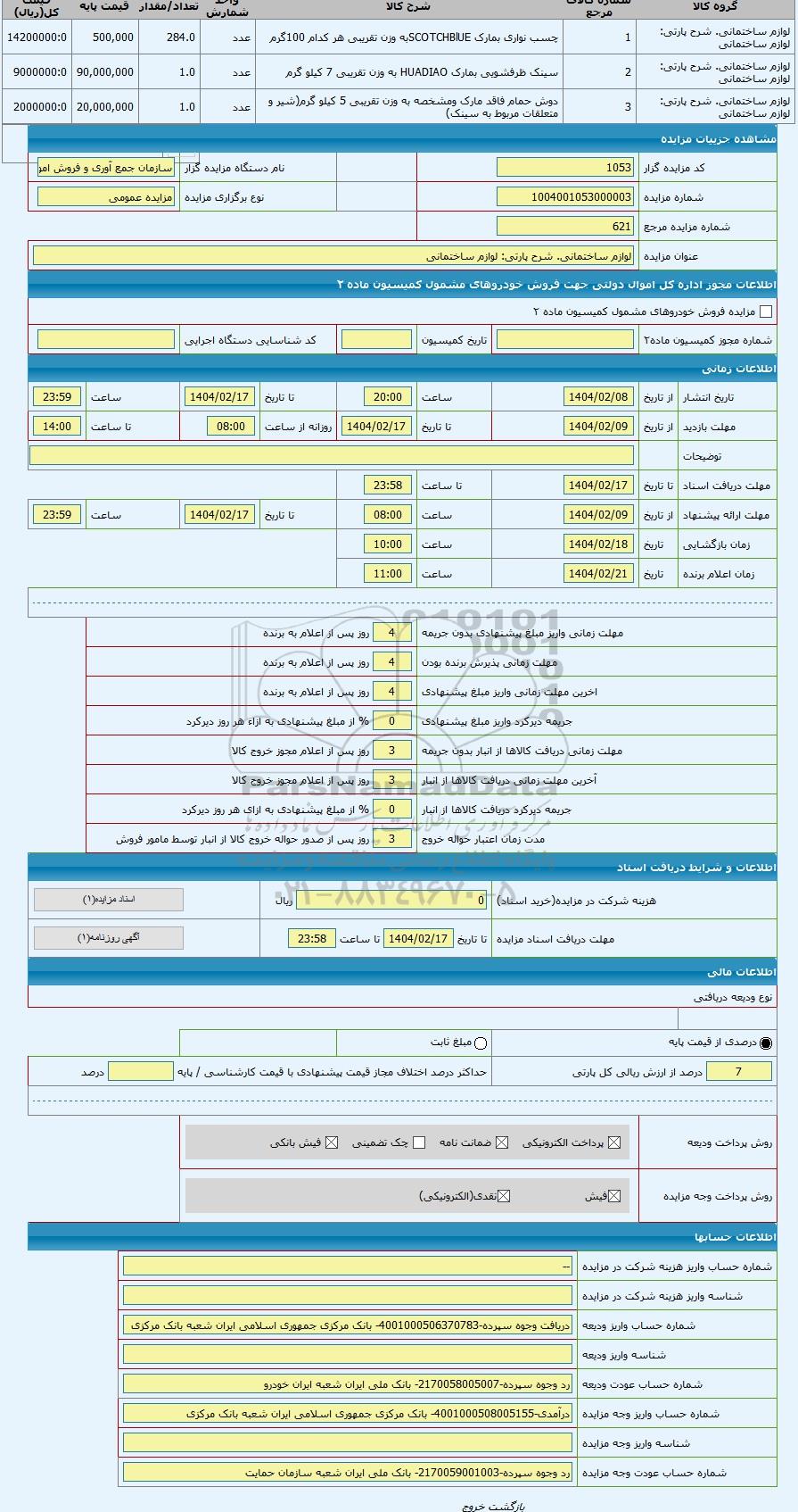 | کد مزایده گزار | 1053 | نام دستگاه مزایده گزار | سازمان جمع آوری و فروش اموال تملیکی | |