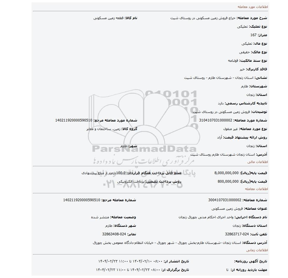 مزایده عمومی مزایده فروش زمین مسکونی در روستای شیت برگزار میگردد. از کلیه افراد متخصص و شرکت‌های واجد شرایط دعوت به عمل می‌آید تا در این مزایده با کد خبرگزاری پارس نماد : 8954521 شرکت نمایند تاریخ شروع مزایده : 1404/02/10 مهلت شرکت در مزایده: تا پایان روز 1404/02/23 مکان برگزاری اموال واگذاری استان‌های زنجان و دسته‌بندی‌های مربوط به این حراجی املاک و زمین میباشد.