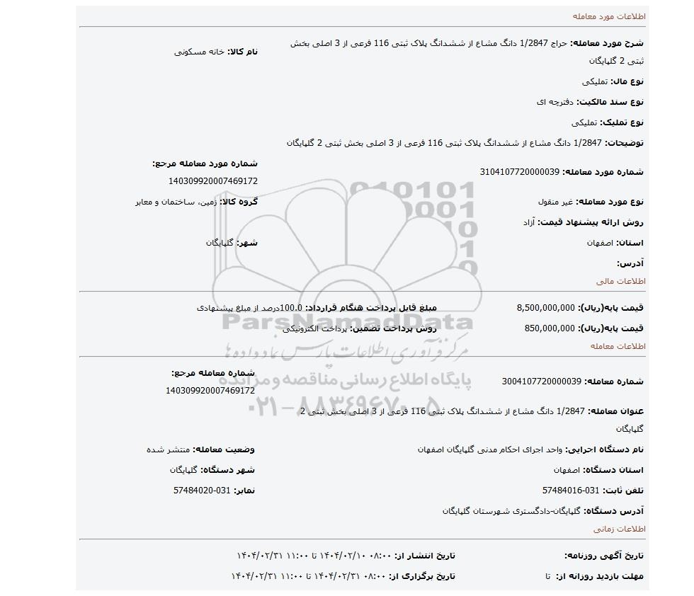 | شرح مورد معامله: حراج 1/2847 دانگ مشاع از ششدانگ پلاک ثبتی 116 فرعی از 3 اصلی بخش ثبتی 2 گلپایگان | نام کالا: خانه مسکونی | |