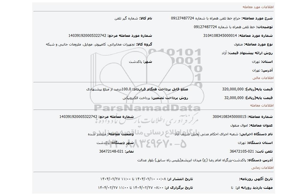 | شرح مورد معامله: حراج خط تلفن همراه با شماره 09127487724 | نام کالا: شماره گیر تلفن | |