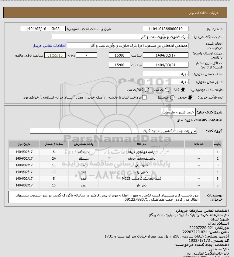 استعلام بها و موضوع استعلام استعلام خرید کنتور و ملزومات به اطلاع کلیه شرکتها و افراد متخصص واجد شرایط میرساند، آگهی گذار در نظر دارد از طریق استعلام بها، نسبت به انتخاب و دریافت پیشنهادات اقدام نماید. این استعلام با کد آگهی ثبت شده در سامانه خبرگزاری پارس نماد : 8955565 منتشر شده است. مشخصات استعلام : تاریخ شروع استعلام: 1404/02/10 آخرین مهلت ارسال پیشنهاد قیمت : 1404/02/17 و محل اجرای پروژه : استان تهران میباشد. استعلام قیمت مورد درخواست : استعلام خرید کنتور و ملزومات با دستهبندیهای تخصصی و گروه های مرتبط : ترانسفورماتور, کنتور برق, انواع کلید و پریزهای برقی و صنعتی, تجهیزات برق و الکترونیک, استعلام اطلاع رسانی میگردد.