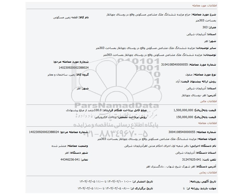 | شرح مورد معامله: حراج مزایده ششدانگ ملک مشاعی مسکونی واقع در روستای چوپانلار بمساحت 303متر | نام کالا: قطعه زمین مسکونی | |