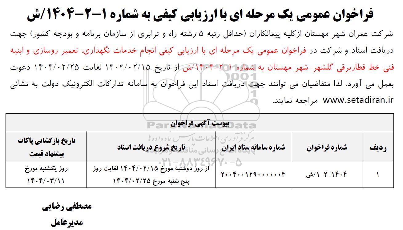 شرکت عمران شهر مهستان از کلیه پیمانکاران حداقل رتبه 5 رشته راه و ترابری از سازمان برنامه و بودجه کشور جهت دریافت اسناد و شرکت در فراخوان عمومی یک مرحله ای با ارزیابی کیفی انجام خدمات نگهداری تعمیر روسازی و ابنیه فنی خط قطار برقی گلشهر - شهر مهستان به شماره 1-2-1404 ش از تاریخ 1404.02.15 لغایت 1404.02.25 دعوت بعمل می آورد لذا متقاضیان میتوانند جهت دریافت اسناد این فراخوان به سامانه تدارکات الکترونیک دولت به نشانی ستاد ایران  مراجعه نمایند