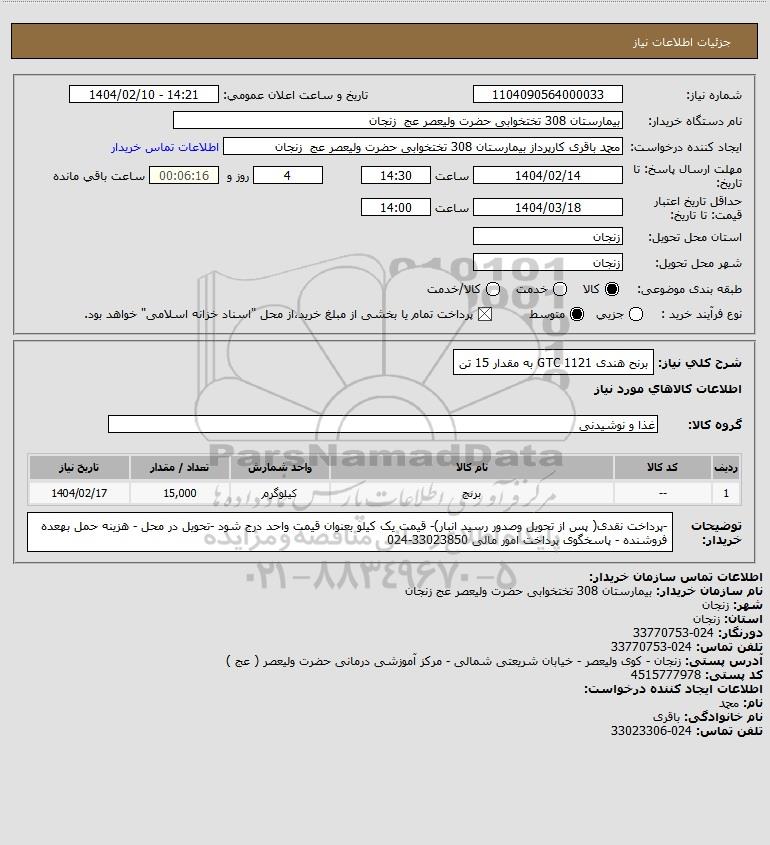 شرح کلی نیاز: برنح هندی 1121 GTC به مقدار 15 تن