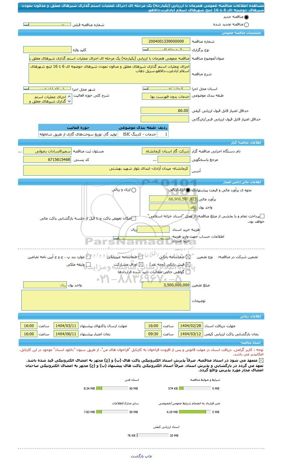 این مناقصه در استان کرمانشاه با دسته بندی های صنفی و تخصصی پیمانکاری نفت و گاز و پتروشیمی برگزار میشود.