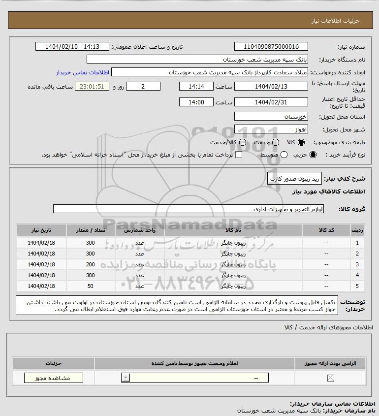 | 1 | -- | ریبون چاپگر | عدد | 300 | 1404/02/18 |