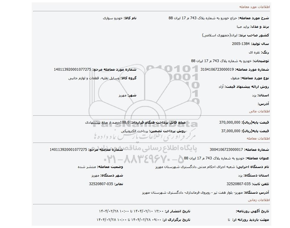 | عنوان معامله: خودرو به شماره پلاک 743 م 17 ایران 88 | ||