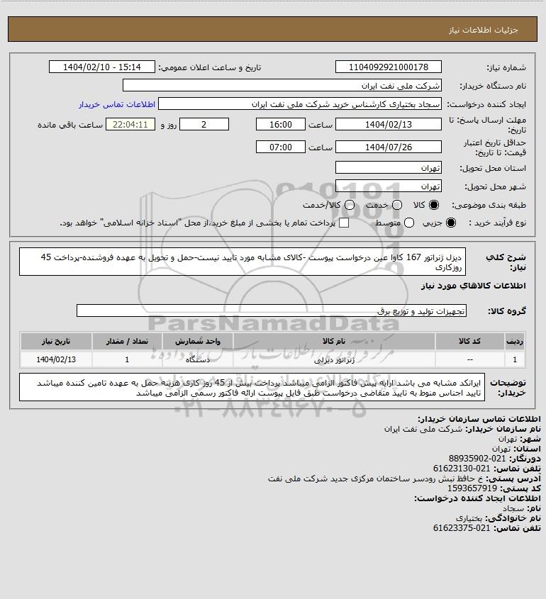 شرح کلی نیاز: دیزل ژنراتور 167 کاوا عین درخواست پیوست -کالای مشابه مورد تایید نیست-حمل و تحویل به عهده فروشنده-پرداخت 45 روزکاری