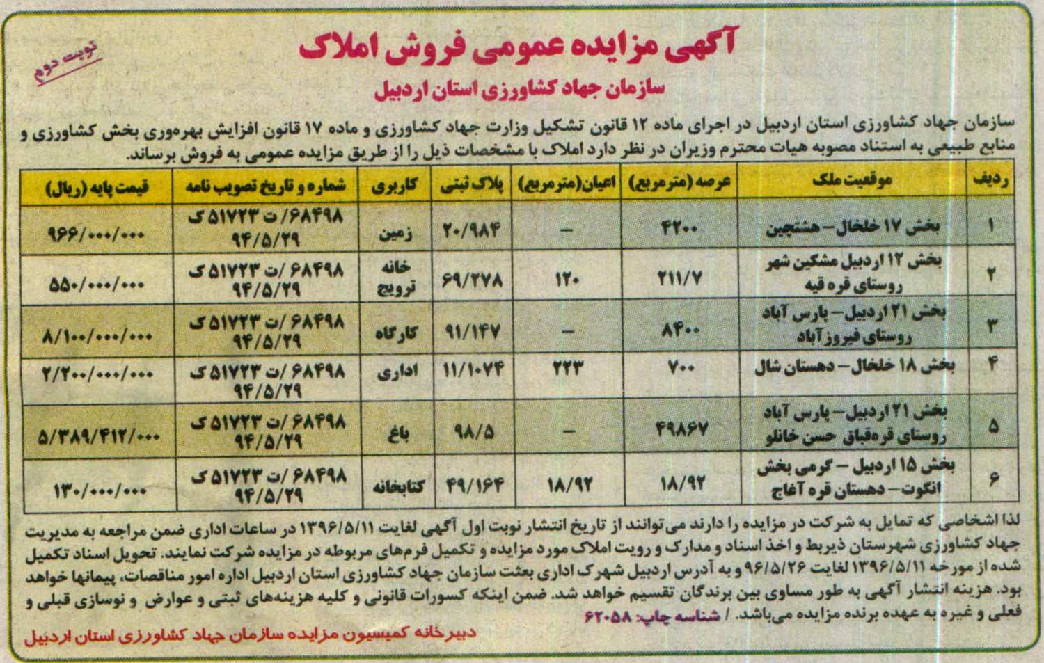 مزایده عمومی فروش املاک کاربری زمین.کارگاه.اداری باغ کتابخانه