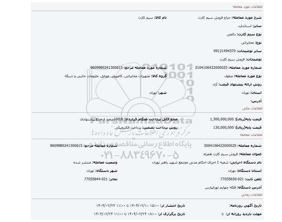 | شرح مورد معامله: حراج فروش سیم کارت | نام کالا: سیم کارت | |
