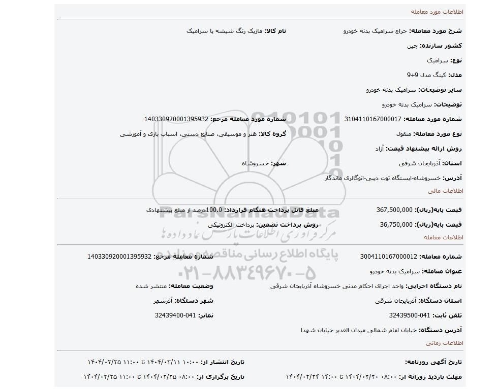 | عنوان معامله: سرامیک بدنه خودرو | ||