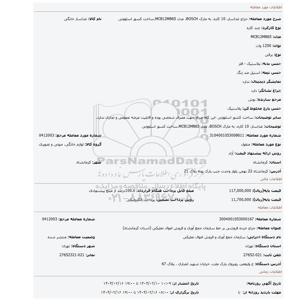 مزایده غذاساز 10 کاره به مارک BOSCH مدل MC812M865ساخت کسور اسلوونی, مزایده، غذاساز، 10 کاره، به مارک BOSCH، مدل MC812M865،ساخت کسور اسلوونی