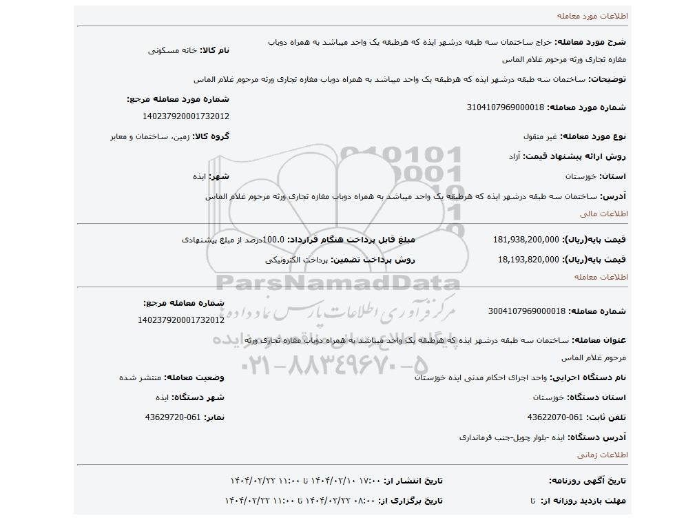 مزایده عمومی مزایده ساختمان سه طبقه درشهر ایذه که هرطبقه یک واحد میباشد به همراه دوباب مغازه تجاری ورثه مرحوم غلام الماس برگزار میگردد. از کلیه افراد متخصص و شرکت‌های واجد شرایط دعوت به عمل می‌آید تا در این مزایده با کد خبرگزاری پارس نماد : 8960326 شرکت نمایند تاریخ شروع مزایده : 1404/02/10 مهلت شرکت در مزایده: تا پایان روز 1404/02/22 مکان برگزاری اموال واگذاری استان‌های خوزستان و دسته‌بندی‌های مربوط به این حراجی املاک و زمین میباشد.