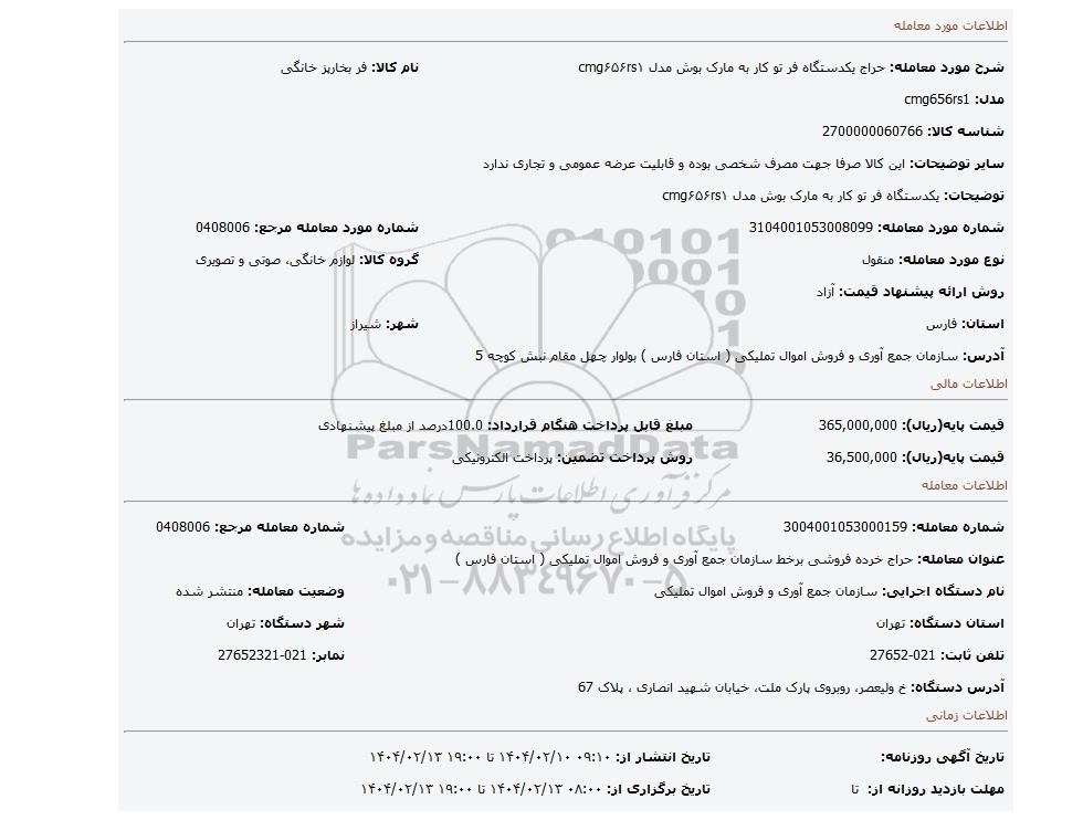| عنوان معامله: حراج خرده فروشی برخط سازمان جمع آوری و فروش اموال تملیکی ( استان فارس ) | ||