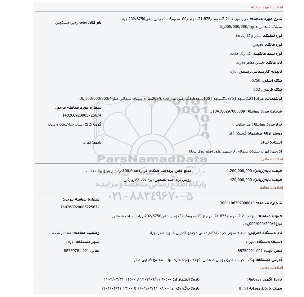 عنوان معامله: میزان2.211سهم از21.875سهم از100سهم6دانگ زمین ثبتی202/6750تهران سبلان شمالی مبلغ000/000/200/4ریال