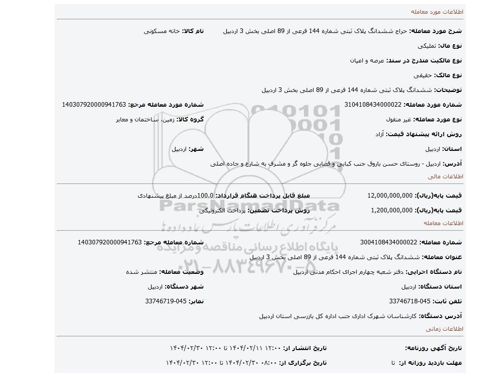شرح مورد معامله: حراج ششدانگ پلاک ثبتی شماره 144 فرعی از 89 اصلی بخش 3 اردبیل | نام کالا: خانه مسکونی | |