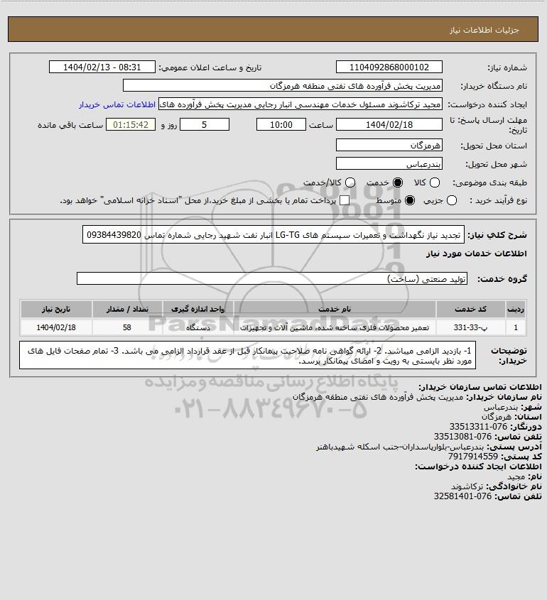 شرح کلی نیاز: تجدید نیاز نگهداشت و تعمیرات سیستم های LG-TG انبار نفت شهید رجایی