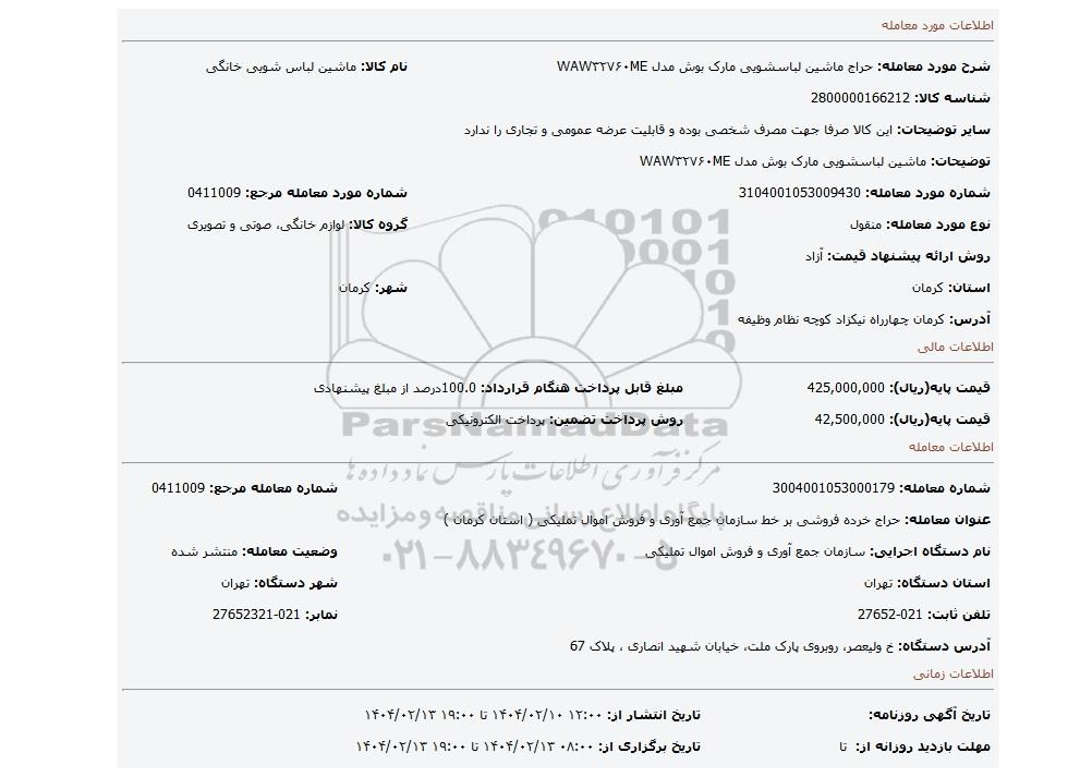 مزایده عمومی مزایده ماشین لباسشویی مارک بوش مدل WAW۳۲۷۶۰ME برگزار میگردد. از کلیه افراد متخصص و شرکت‌های واجد شرایط دعوت به عمل می‌آید تا در این مزایده با کد خبرگزاری پارس نماد : 8963392 شرکت نمایند تاریخ شروع مزایده : 1404/02/10 مهلت شرکت در مزایده: تا پایان روز 1404/02/13 مکان برگزاری اموال واگذاری استان‌های کرمان و دسته‌بندی‌های مربوط به این حراجی متفرقه میباشد.