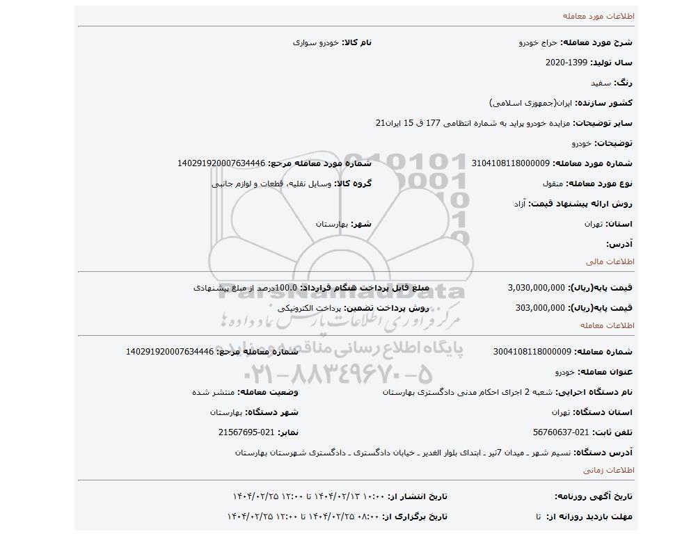 | شماره مورد معامله: 3104108118000009 | شماره مورد معامله مرجع: 140291920007634446 | |