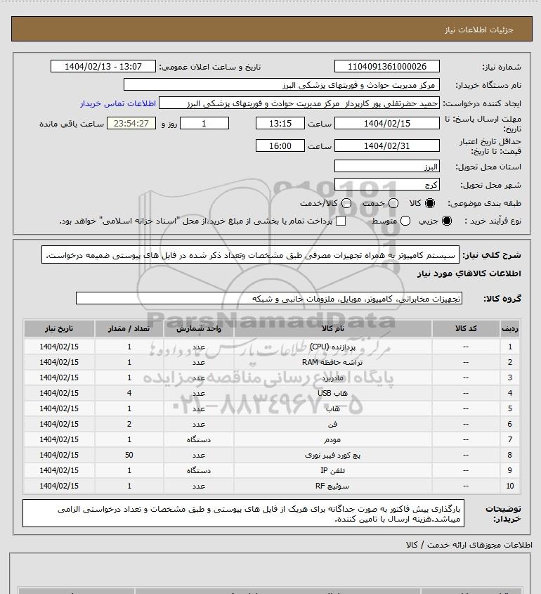 نام دستگاه خریدار: مرکز مدیریت حوادث و فوریتهای پزشکی البرز