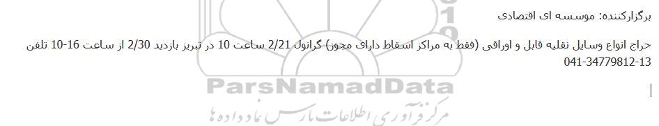 حراج انواع وسایل نقلیه قابل و اوراقی (فقط به مراکز اسقاط دارای مجوز) گرانول 2/21 ساعت 10 در تبریز بازدید 2/30 از ساعت 16-10 تلفن 13-34779812-041
