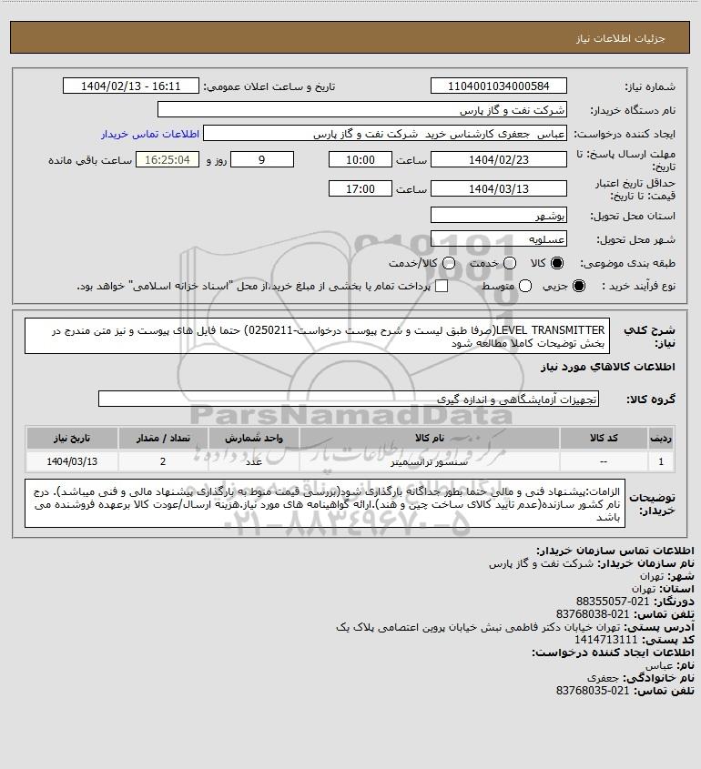 شرح کلی نیاز: LEVEL TRANSMITTER(صرفا طبق لیست و شرح پیوست درخواست-0250211) حتما فایل های پیوست و نیز متن مندرج در بخش توضیحات کاملا مطالعه شود