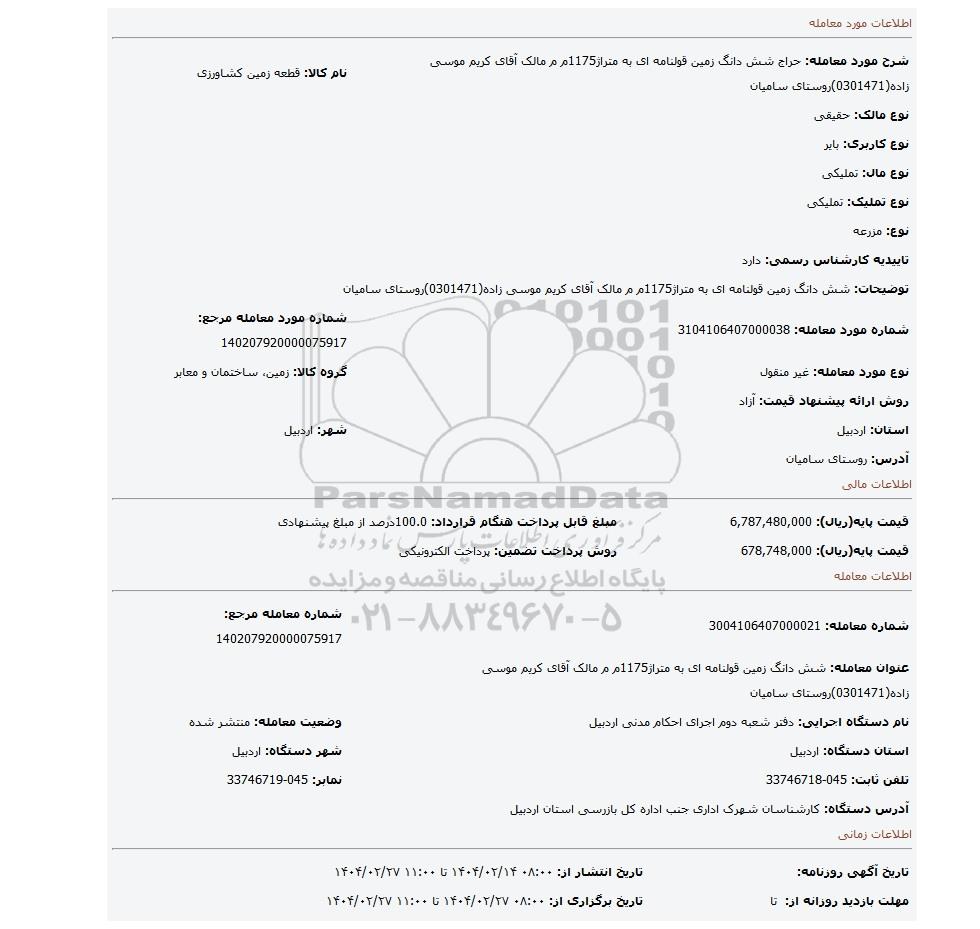 شرح مورد معامله: حراج شش دانگ زمین قولنامه ای به متراژ1175م م مالک آقای کریم موسی زاده(0301471)روستای سامیان | نام کالا: قطعه زمین کشاورزی | |