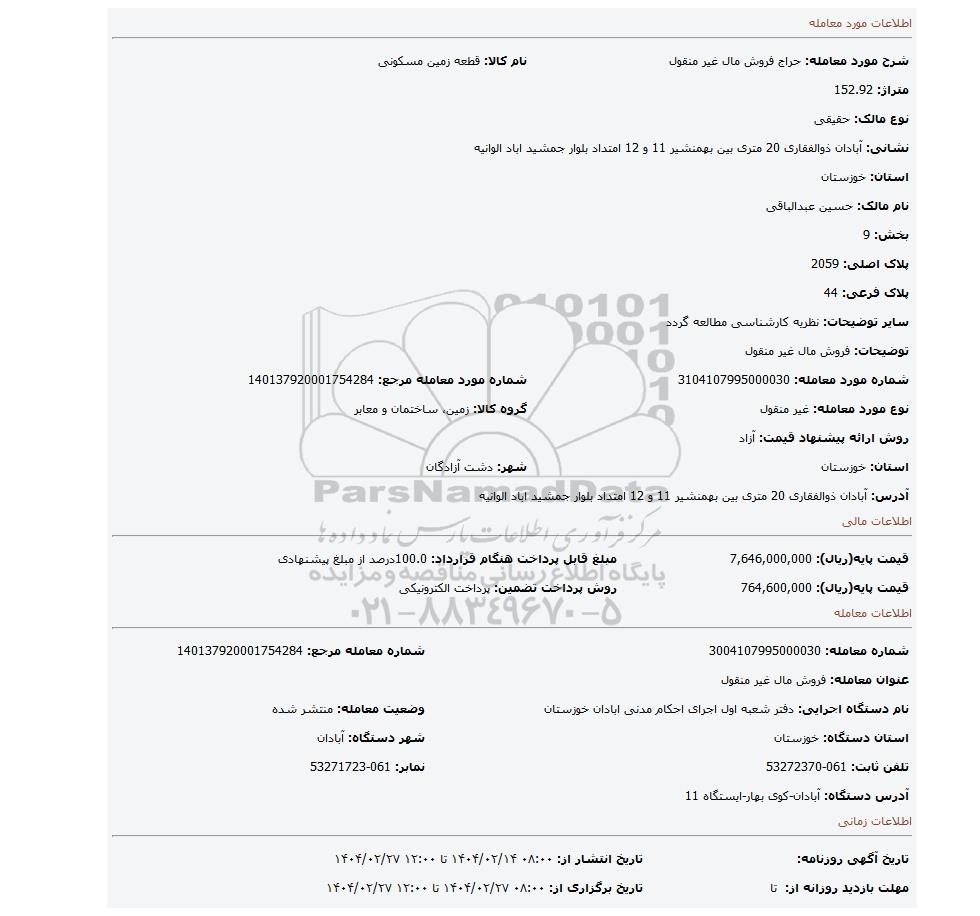 | شماره مورد معامله: 3104107995000030 | شماره مورد معامله مرجع: 140137920001754284 | |
