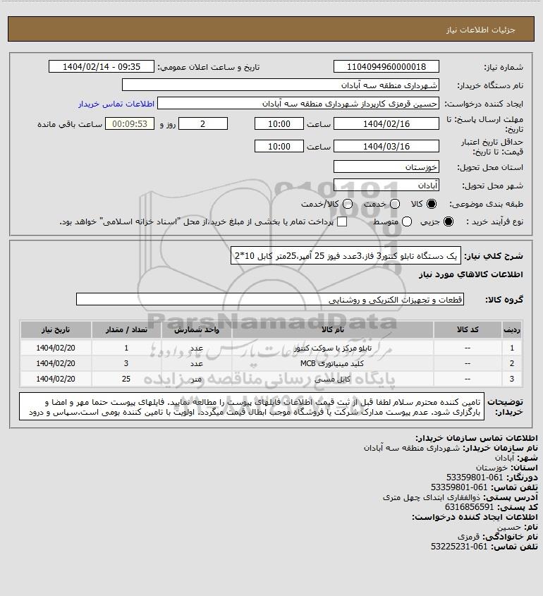 شرح کلی نیاز: یک دستگاه تابلو کنتور3 فاز،3عدد فیوز 25 آمپر،25متر کابل 10*2