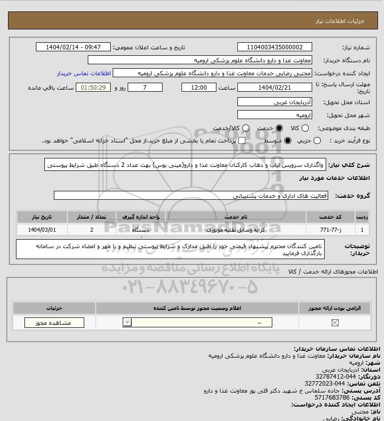 شرح کلی نیاز: واگذاری سرویس ایاب و ذهاب کارکنان معاونت غذا و دارو(مینی بوس) بهت عداد 2 دستگاه طبق شرایط پیوستی