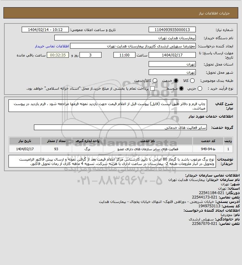 شرح کلی نیاز: چاپ فرم و دفاتر طبق لیست (فایل) پیوست قبل از اغلام قیمت جهت بازدید نمونه فرمها مراجعه شود . فرم بازدید در پیوست میباشد.