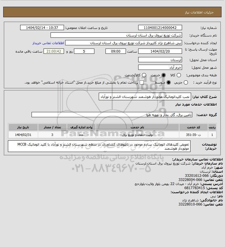 شرح کلی نیاز: نصب کلیداتوماتیک موتوردار هوشمند شهرستان الشتر و نورآباد