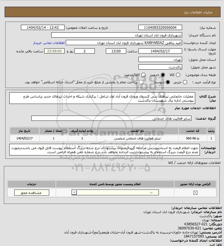 شرح کلی نیاز: عملیات جابجایی تیرهای بتنی کندروی ورودی فرون آباد اول شامل : برکناری شبکه و احداث تیرهای جدید براساس طرح پیوستی اداره برق شهرستان پاکدشت