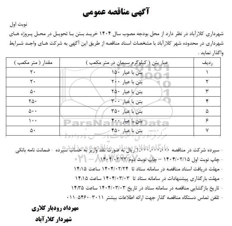 شهرداری کلارآباد در نظر دارد از محل بودجه مصوب سال 1404 خرید بتن با تحویل در محل پروژه های شهرداری در محدوده شهر کلارآباد با مشخصات اسناد مناقصه از طریق این آگهی به شرکتهای واجد شرایط واگذار نماید.