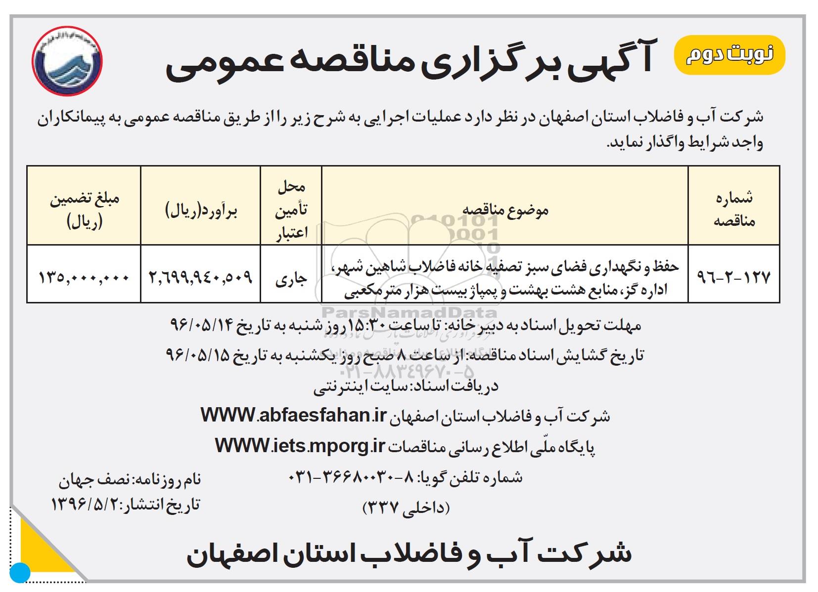 | 96-2-127 | حفظ و نگهداری فضای سبز تصفیه خانه فاضلاب شاهین شهر، اداره گز، منابع هشت بهشت و پمپاژ بیست هزار متر مکعبی |